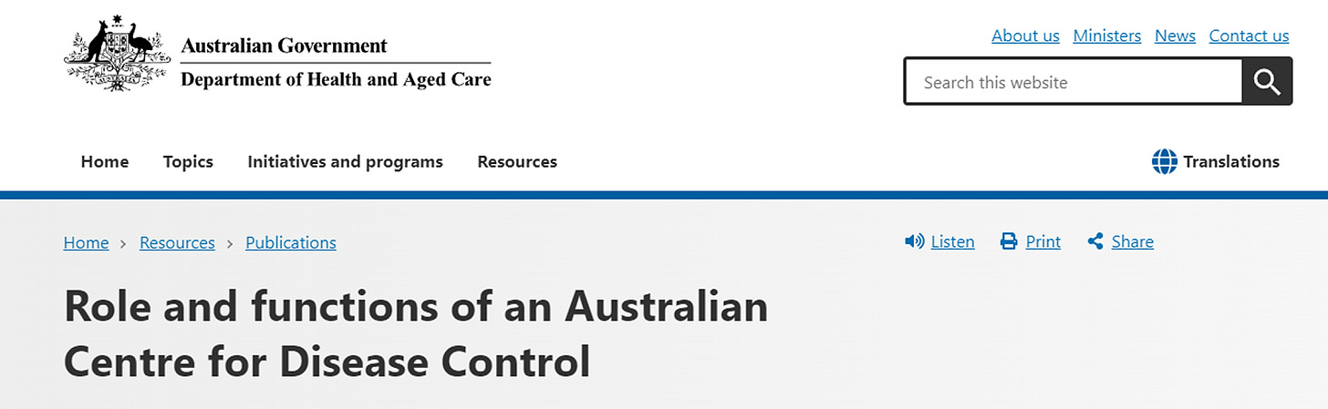 See “Role and functions of an Australian Centre for Disease Control” first paragraph; page: 21 PAPER PDF COPY SOURCE URL: https://www.health.gov.au/sites/default/files/documents/2022/11/role-and-functions-of-an-australian-centre-for-disease-control_0.pdf