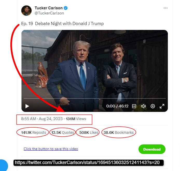 Incredible: Trump’s Interview with Tucker Hits 40 million Views In 20 Minutes | written by Summer Lane | (Right Side Broadcasting Network) | August 23, 2023 | Original Source of: EDITORIAL | READ/WATCH HERE