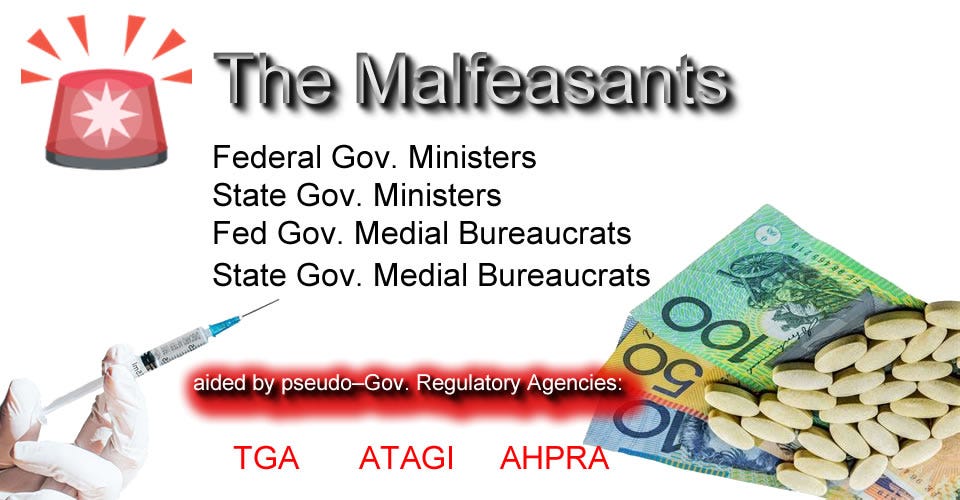 A Cabal of Strategically Placed (Federal and State) Government Ministers and Medial Bureaucrats were aided by pseudo–Gov. Regulatory Agencies such as TGA, ATAGI & AHPRA to commit a Combination of Criminal Violations of the Highest Order that are frankly Unforgivable.