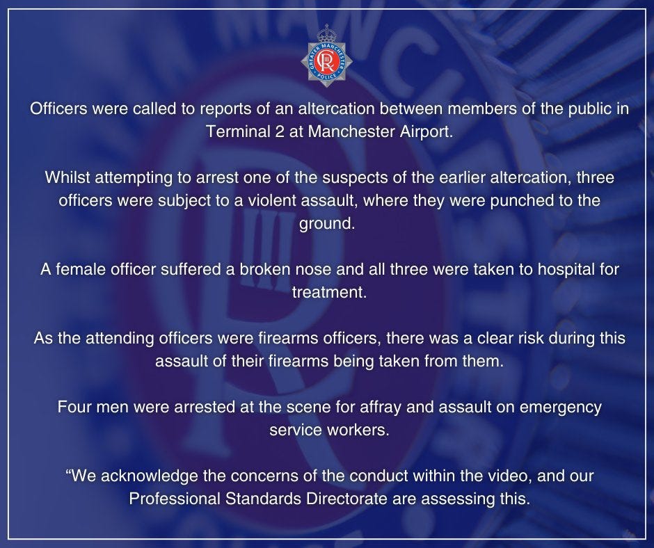 Firearms Officers at Manchester Airport called to subdue seriously violent man who had already broken the nose of a non armed Airport female police officer and left 3 other armed Airport officers hospitalized.