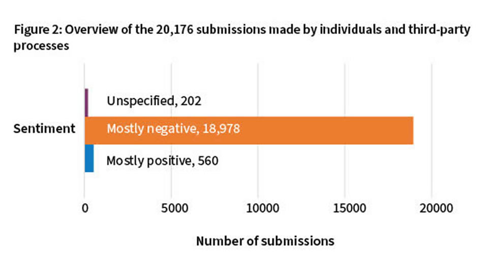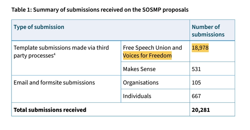 The DIA summary document names Voices for Freedom (VFF) and the Free Speech Union (FSU) as responsible for almost 19,000 combined feedback submissions using templates from VFF and FSU websites.