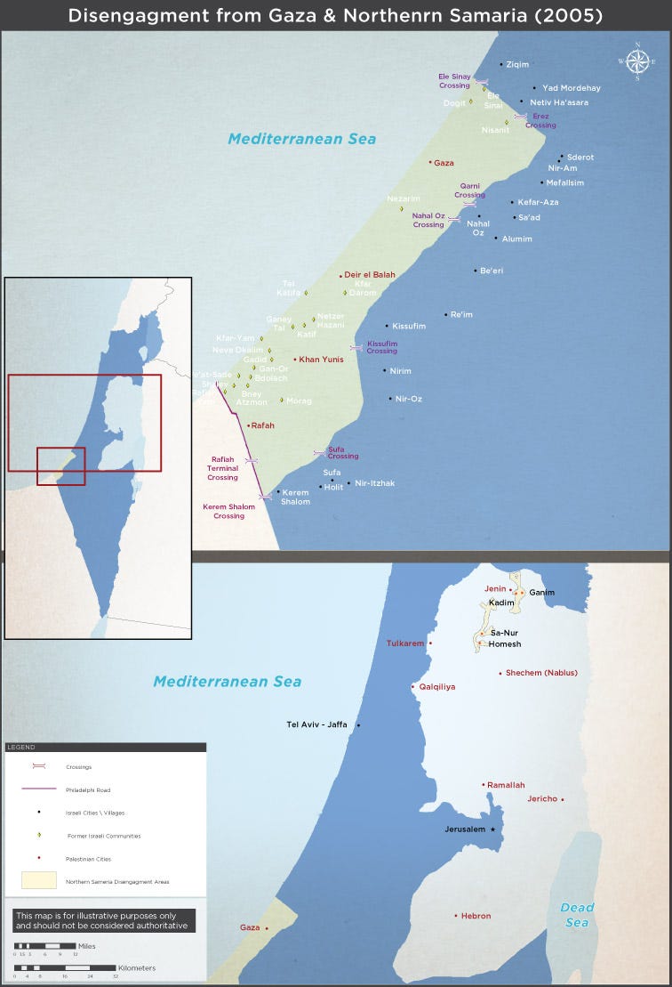 {Israel's Disengagement from Gaza and North Samaria (2005) The motivation behind the disengagement was described by Sharon's top aide as a means of isolating Gaza and avoiding international pressure on Israel to reach a political settlement with the Palestinians. The disengagement plan was implemented in August 2005 and completed in September 2005.}