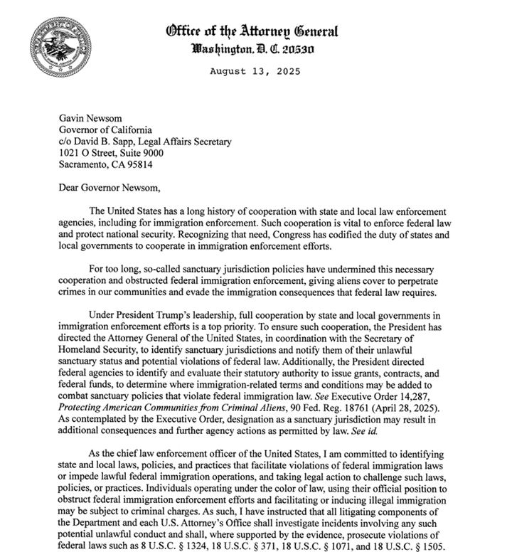 Credit to: Attorney General Pamela Bondi | 𝕏-handle: @AGPamBondi | 𝕏-tagline: | 𝕏-post: 1956030770704798107 | 𝕏-AWST-Timestamp: 12:30 AM | 𝕏-AWST-Datestamp: Aug 15, 2025. | IMAGE SOURCES: 𝕏-F-name 01: DOJ 𝕏1956030770704798107_photo_1.jpg | 𝕏-URL 01: 1956030770704798107/photo/1 | 4CM-notes: AG to Gavin Newson 2025AUG13.pdf
