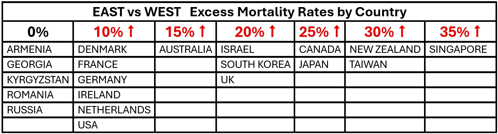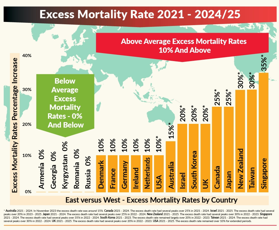 2025 AUG 22 Pfizer vaccinated country leads in Excess Mortality! AUS 15%, ISR 20%, ROK 20%, GBR 20%, CAN 25%, JPN 25%, NZL 30%, TWN 30% and SGP 35%