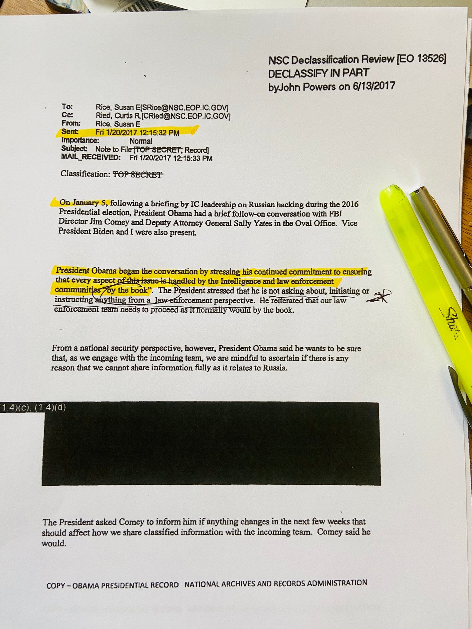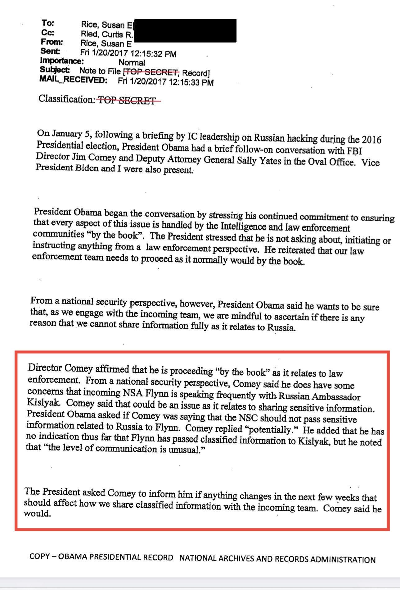 Susan Rice sent this email to herself January 20, 2017 documenting a White House meeting earlier that month with President Obama, FBI Director Comey and others about "Russian hacking" during the 2016 election.