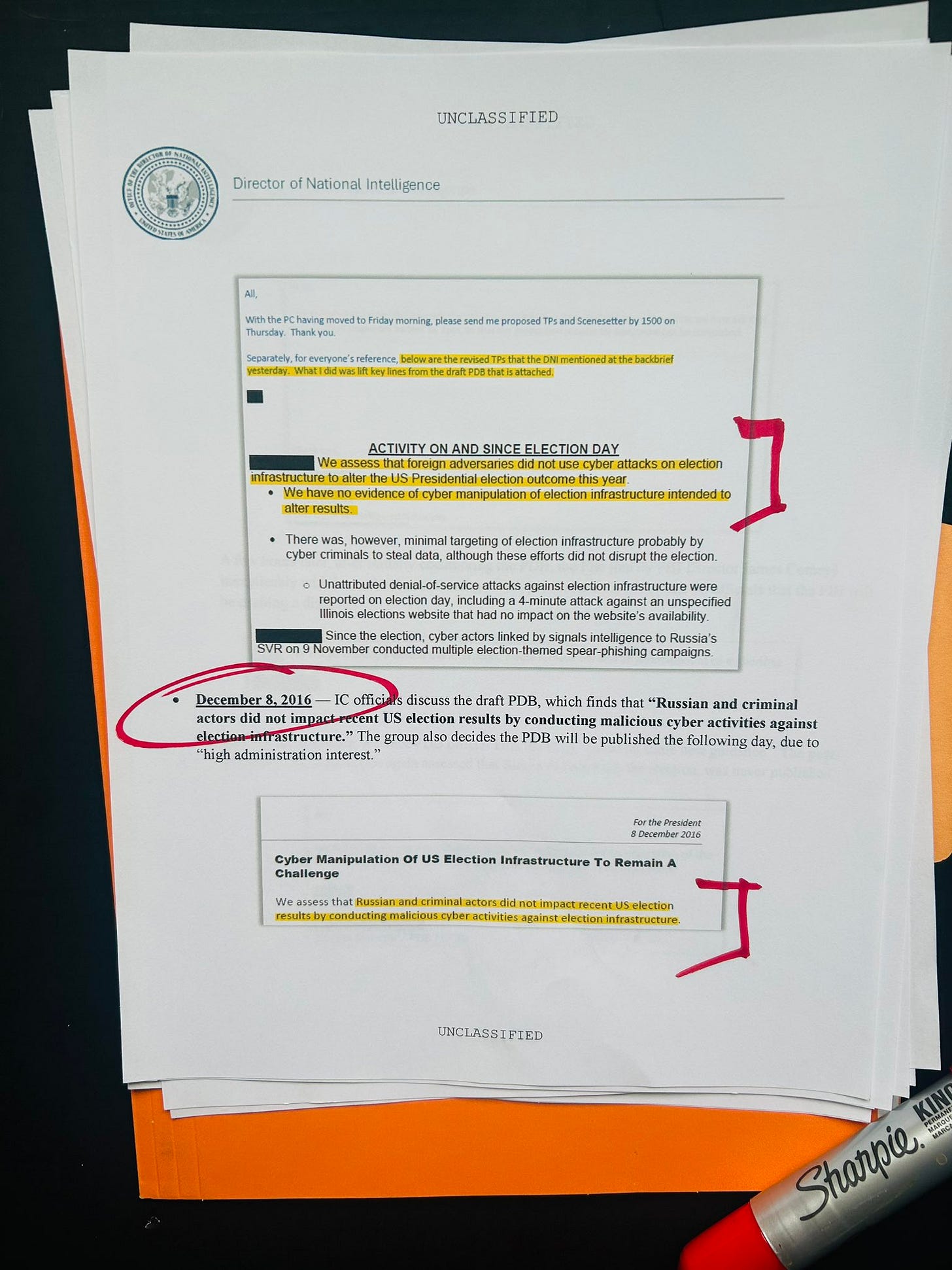 This highly classified record, which is a daily national security analysis for the President, assessed that “Russian and criminal actors did not impact recent US election results by conducting malicious cyber activities against (election) infrastructure.”