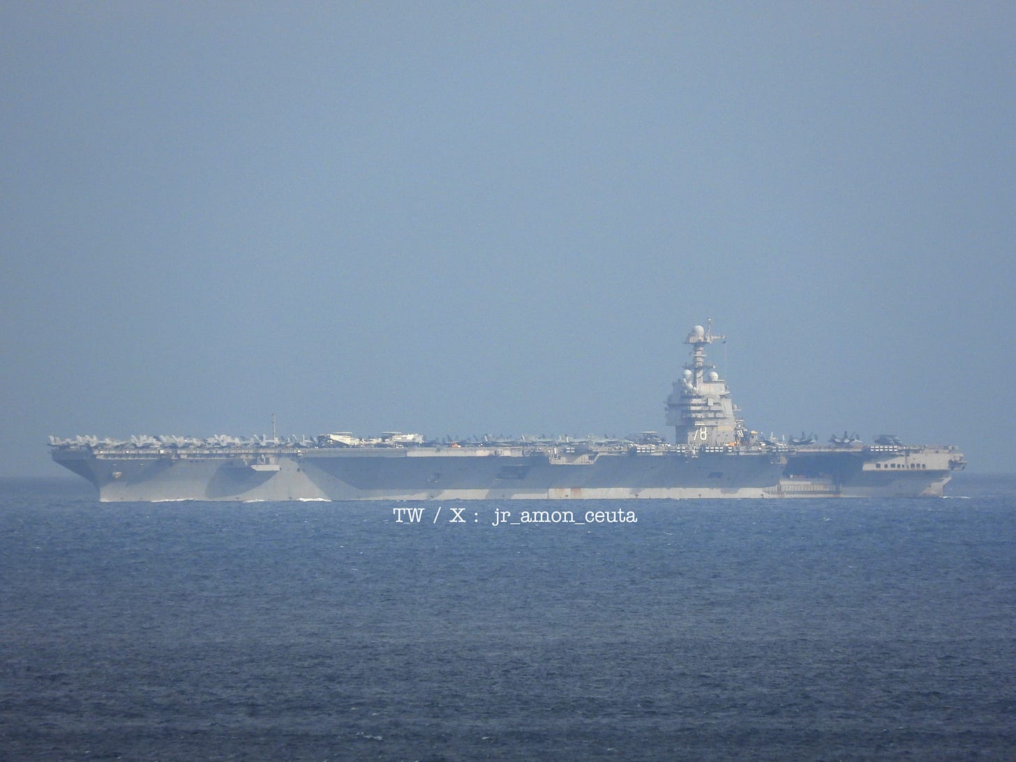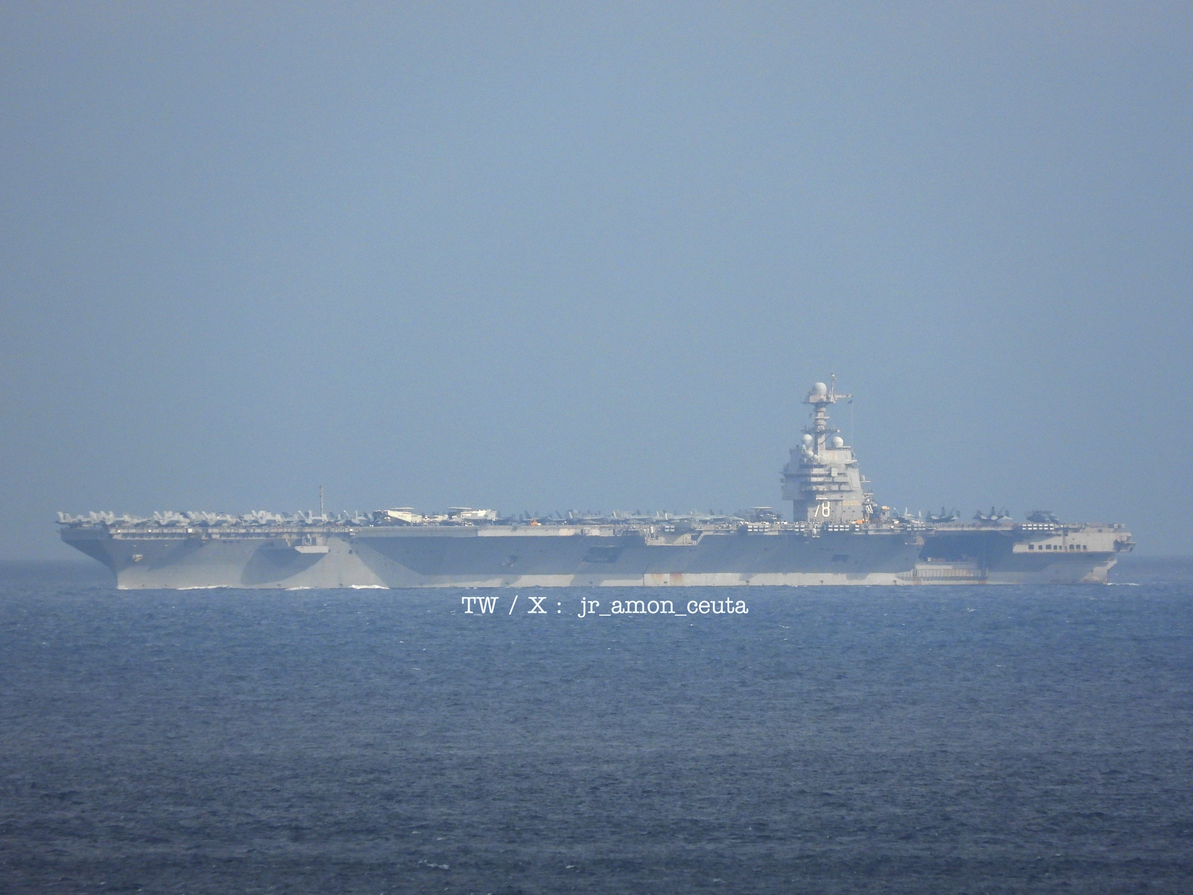 Credit to: Jr Amon Ceuta | 𝕏-handle: @jr_amon_ceuta | 𝕏-tagline: USS Gerald R. Ford (CVN 78) Gerald R. Ford-class aircraft carrier westbound in the Strait of Gibraltar (leaving the Mediterranean) | 𝕏-post: 1985659634292818426 | 𝕏-AWST-Timestamp: 6:45 PM | 𝕏-AWST-Datestamp: Nov 4, 2025 | IMAGE SOURCES: 𝕏-F-name 01: MONKEYWERX.𝕏1985659634292818426_photo_1.jpg | 𝕏-URL 01: 1985659634292818426/photo/1 | 4CM-notes: cc: #USSGERALDRFORD #CVN78 #USNavy | @CVN78_GRFord | @USNATO | @WarshipCam
