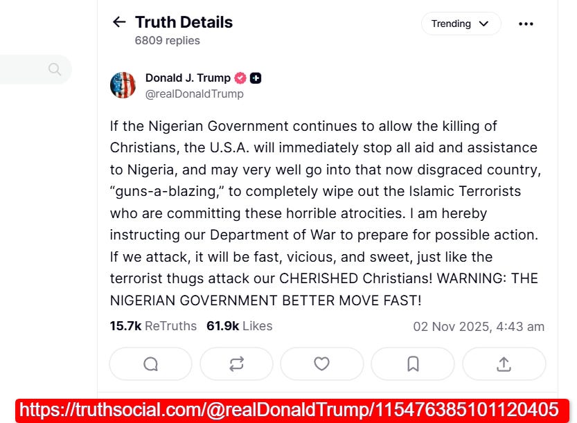 EDITORIAL 12 Credit to: Details | TS-handle: @handle | TS-tagline: If the Nigerian Government continues to allow the killing of Christians | TS-post: 115476385101120405 | TS-Timestamp: 4:43 AM | TS-Datestamp: 02 Nov 2025 | 4CM-notes: If the Nigerian Government continues to allow the killing of Christians, the U.S.A. will immediately stop all aid and assistance to Nigeria, and may very well go into that now disgraced country, “guns-a-blazing,” to completely wipe out the Islamic Terrorists who are committing these horrible atrocities. I am hereby instructing our Department of War to prepare for possible action. If we attack, it will be fast, vicious, and sweet, just like the terrorist thugs attack our CHERISHED Christians! WARNING: THE NIGERIAN GOVERNMENT BETTER MOVE FAST! | TS-IMAGE SOURCES: TS-F-name 01: MONKEYWERX.img-57277873.png | TS-URL 01: MONKEYWERX.img-57277873 | 4CM-notes: