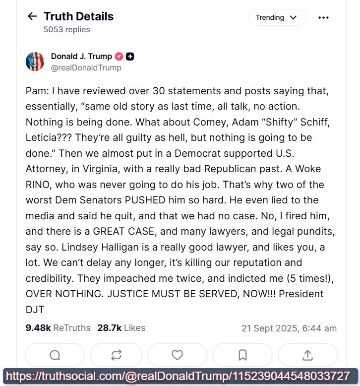 Credit to: President Donald Trump | TS-handle: @realDonaldTrump | TS-tagline: Pam: I have reviewed over 30 statements and posts saying that, essentially, “Same Old Story as Last Time, All Talk, No Action. | TS-post: 115239044548033727 | TS-Timestamp: 6:44 am | TS-Datestamp: 21 Sept 2025 | 4CM-notes:
